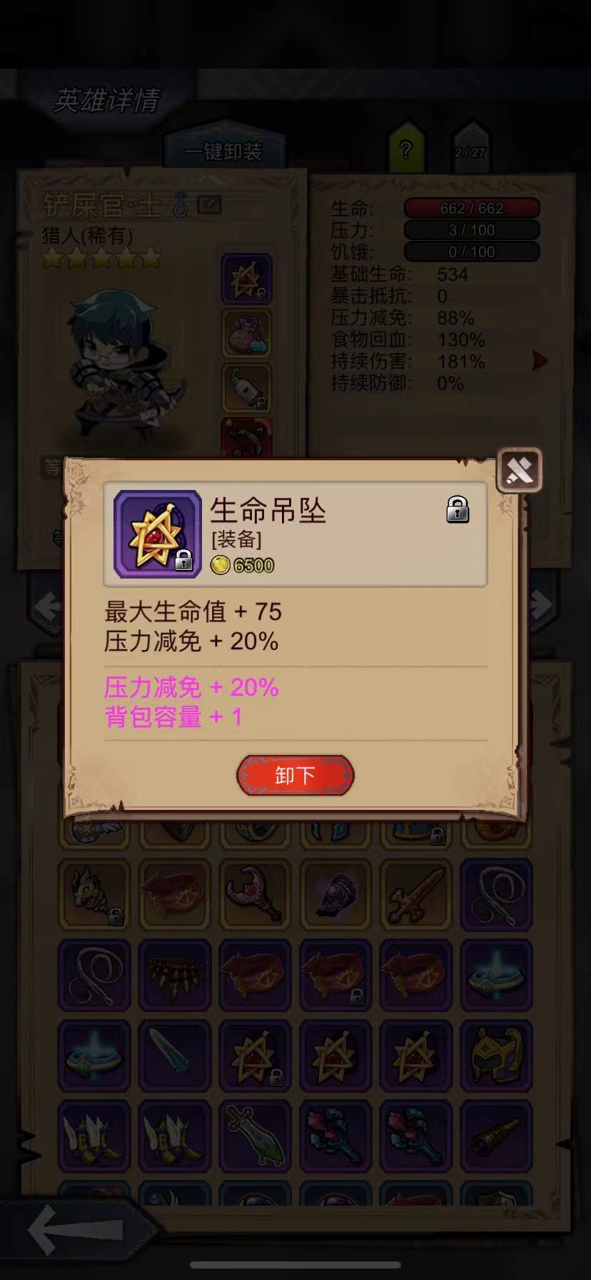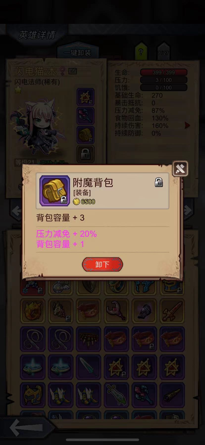 你可以看到我基本上每个英雄都带了3个背包(紫,蓝,绿)这是为了我们前期或者是中期我们刷试炼之塔的时候,能够装更多东西,通常我们只有1个队伍就是我们的主力了,我们可以让不上场的英雄带满背包来装东西,(前期我们可以爬个50-90层左右)