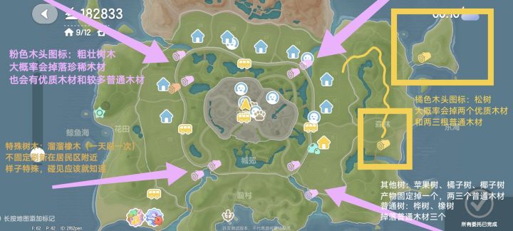 珍稀木材就是图中粉色图标,基本是环小镇外围一圈。