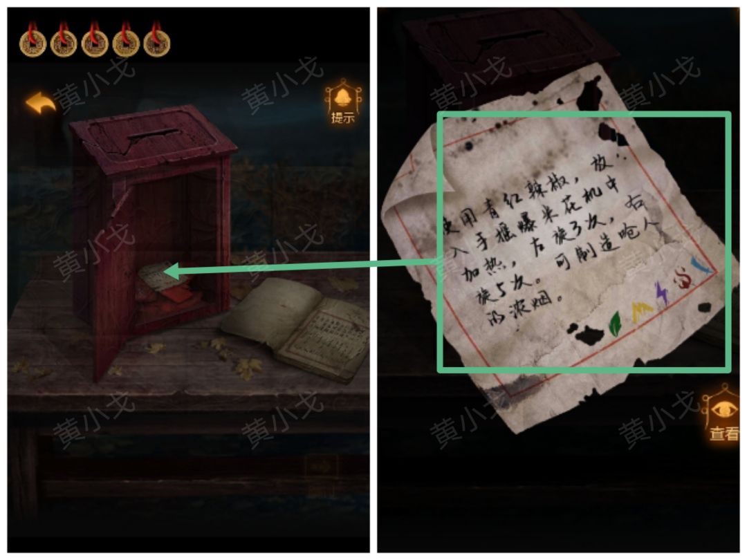 14.打开箱子,查看纸条内容,获得线索(把红辣椒和青辣椒放入手摇爆米花机中加热,左3次,右5次和符号线索)