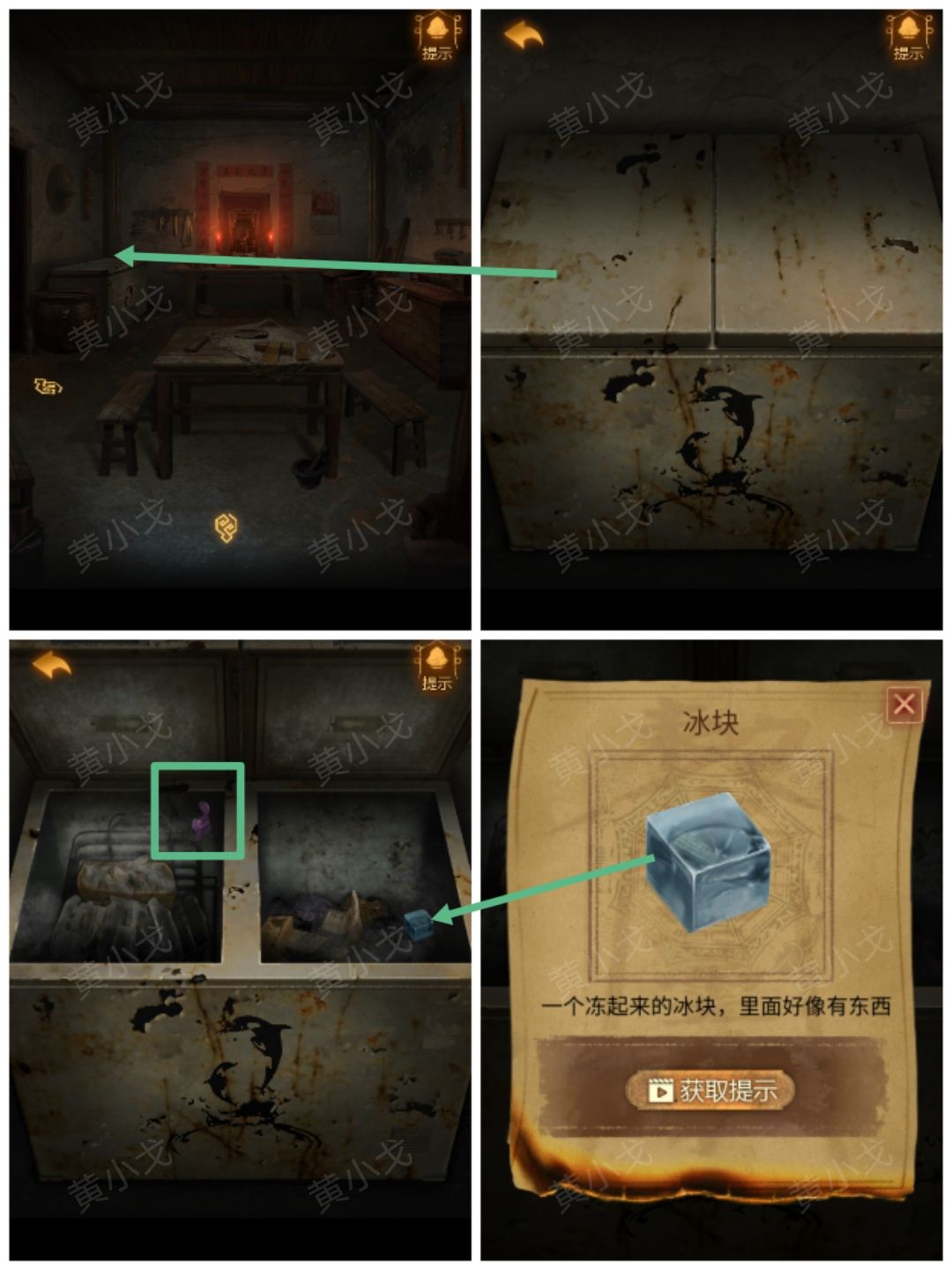 22.(大厅)点击冰箱,打开,获得【冰块】(注意看紫色小人雕像的姿势)