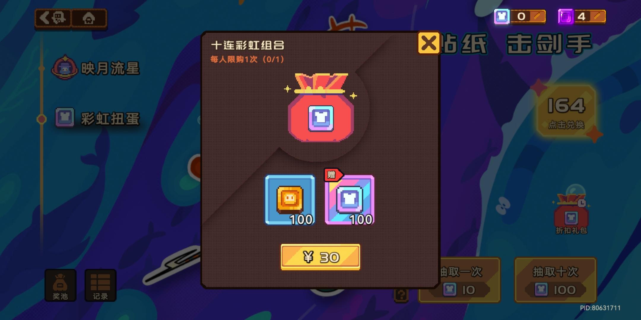 即使流星礼包还多18宝石也是完全不值的(价值大概十多元),况且还贵了38元——但是买月卡就可以直接享受到两个礼包的价值,还省了68元,并且多出80彩虹币和一大堆金币!可以再凹一下(但问题是现在只有月卡和礼包能出彩虹币,所以想凹还得30天后???)又一发十连(多出来的那些宝石金币在68元面前简直可以忽略不计)。