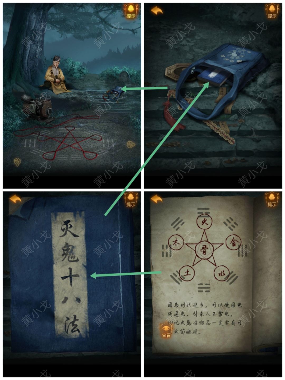 31.(路口)点击法阵,根据《灭鬼十八法》上的线索,把【香】放到正确的位置上,用【打火机】点燃