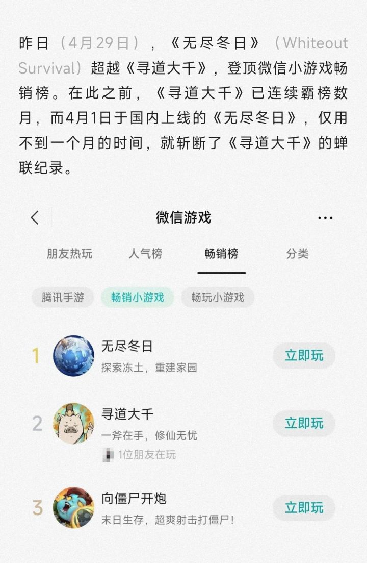无尽冬日(Whiteout Survival)仅用时29天就在微信小游戏畅销榜单超越当时最大热门放置游戏《寻道大千》成为畅销榜一。