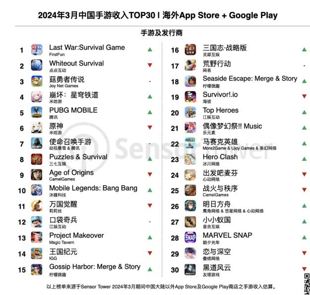 此前,其出海作品早已大获成功,我们可以在P2看到,3月份出海榜单将星穹铁道和pubg手游挤出出海前三就游此游。