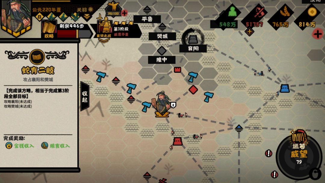 触发事件【蛇有二歧】,听取关平的建议,触发事件【釜底抽薪】,完成任务“蛇有二歧”:攻占襄阳和樊城,即可视作完成第三阶段所有任务。