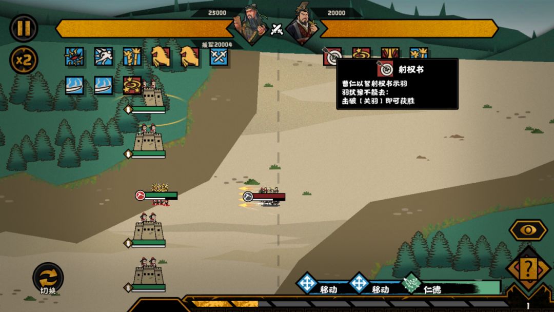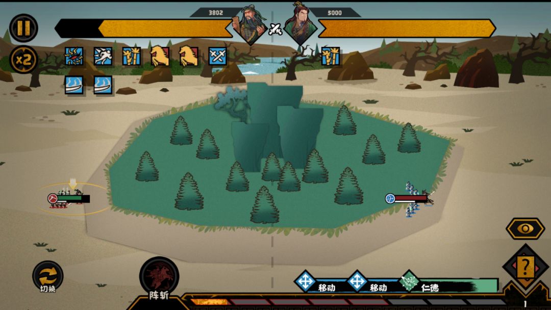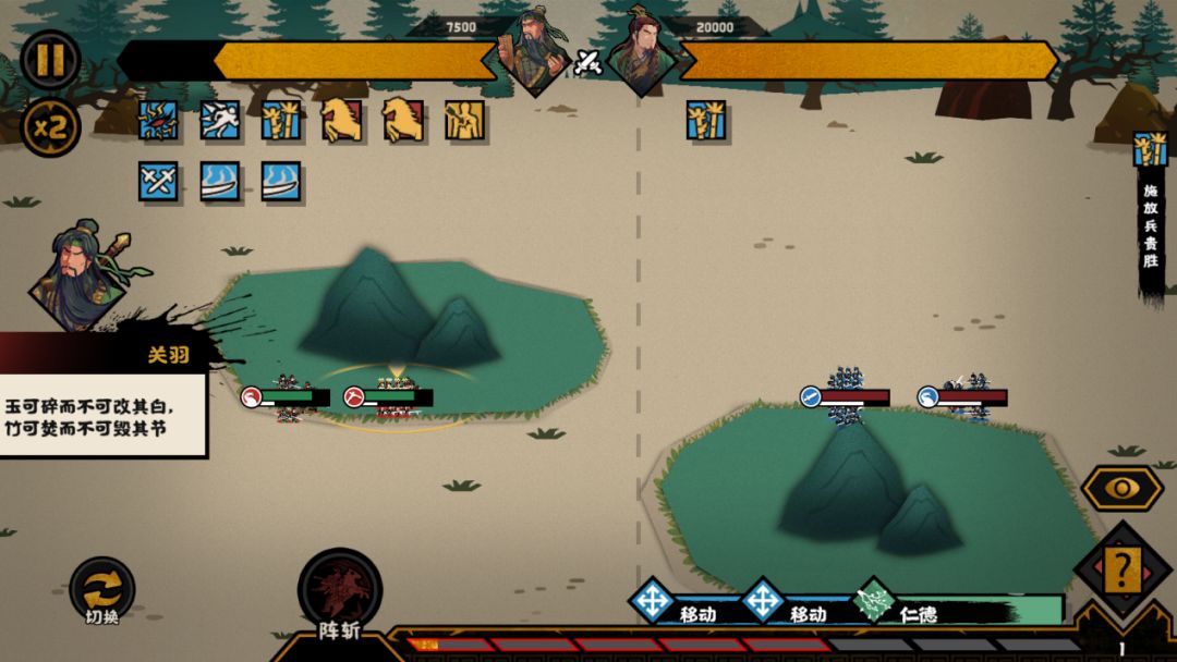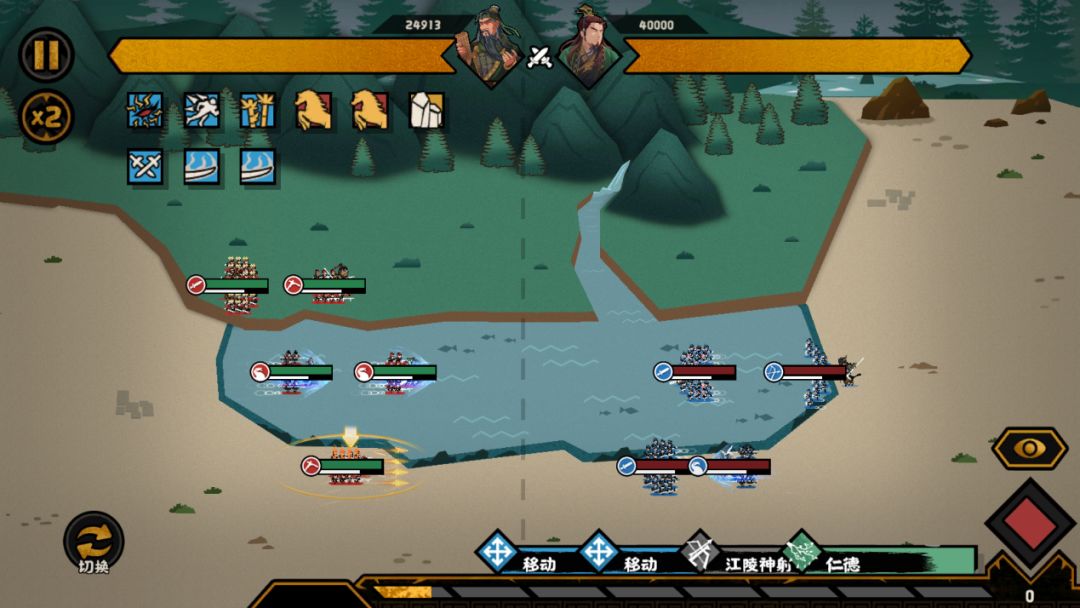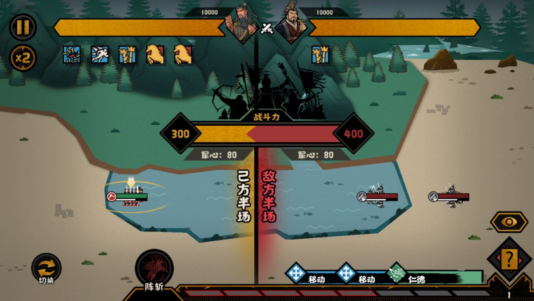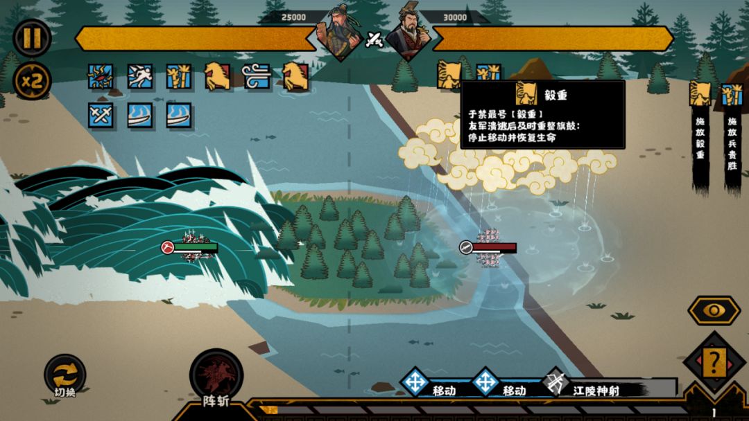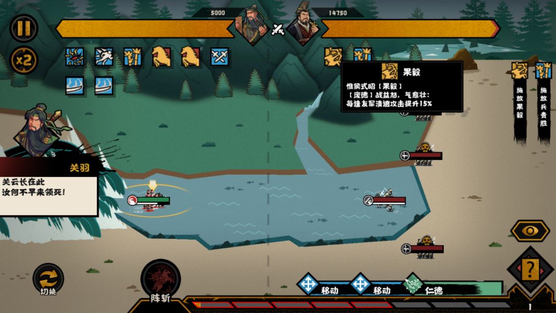 水淹七军-庞德:开局利用冲锋对庞德造成伤害后,使用【移动】向后拉扯,让庞德处在水域之中,同时再次使用冲锋消灭庞德。后续使用移动勾引剩余枪兵进入水域或者上岸变成枪兵即可。