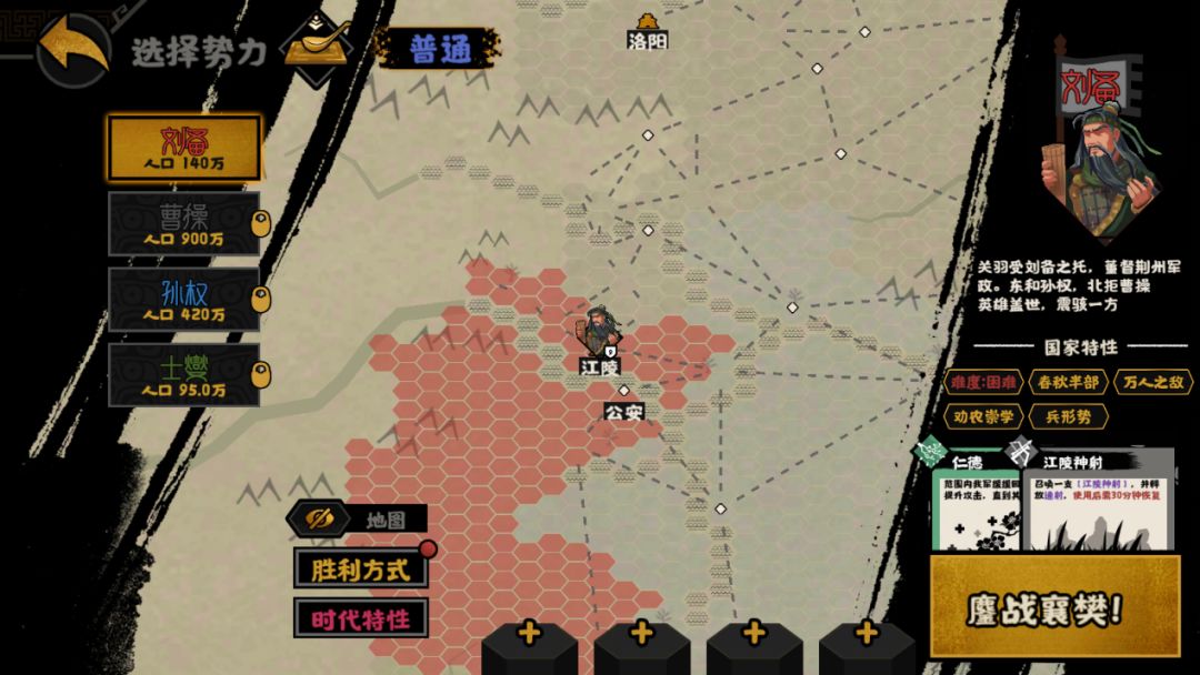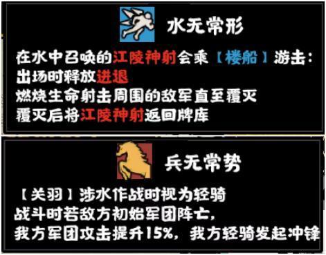 关羽势力的特性大多和名臣本身有关,吸纳并简化了名臣本身的累战兵法,同时也引入了之前夷陵之战中关羽的战役兵法以及赤壁之战中的特色楼船单位,本身战斗方面需要关注民心以及军心,通过二者的联动来提升战斗力,同时可以利用好关羽的累战兵法以及【兵无常势】,利用【移动】将敌军拖入水中进行战斗触发【水势】,并依据时机使用卡牌【进退】触发兵法【拖刃】,或者进入敌方半场触发兵法【掩袭】。