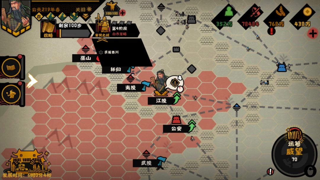 玩法上:本次上线的襄樊之战玩法采用了类似班超守西域的模式,同样以政略做为核心资源,剧本中离线发展时间、行动力、地图资源将不再随时间增长,在阶段任务模式下,每次进入新的阶段:如果完成前一阶段的所有任务,则会补充30点政略与2个【筹】;有任务未完成或者耗尽政略自动进入下一阶段,则会补充150政略,同时,取消了汉末三国的对垒战玩法。