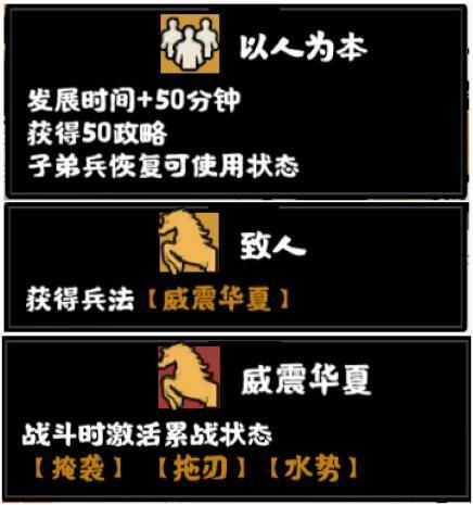 【劝农崇学】:每有2点民心,军心提升1点;每有2点军心,战斗力提升1。