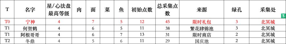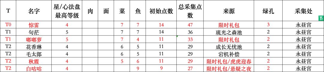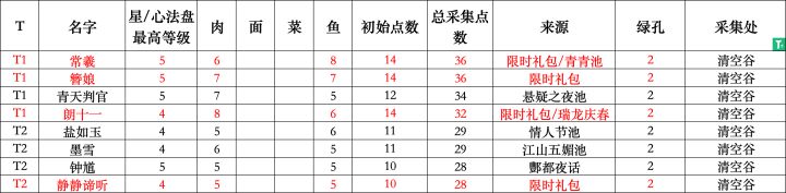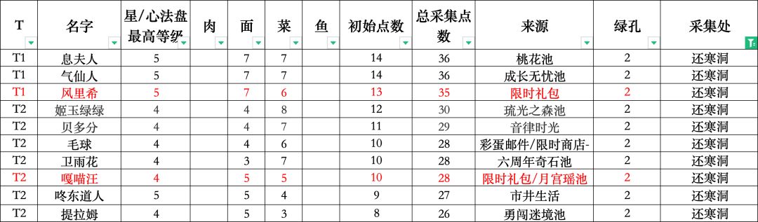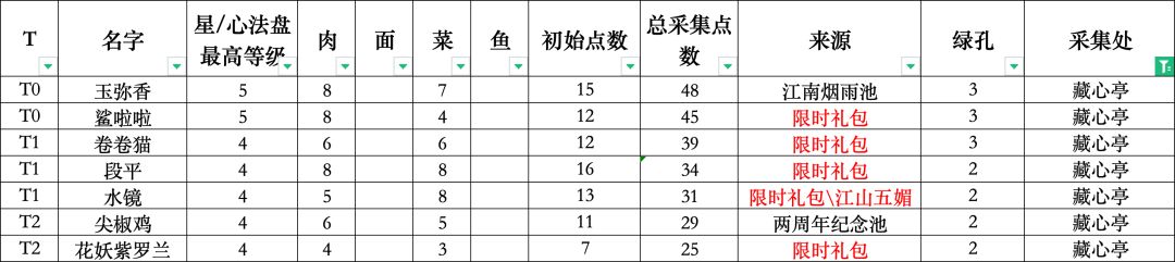 做了一个采集厨师的排序,哪个点数高、补什么池子一眼出,红色的是礼包厨。有不对的指出改正,有帮助的收藏点赞。