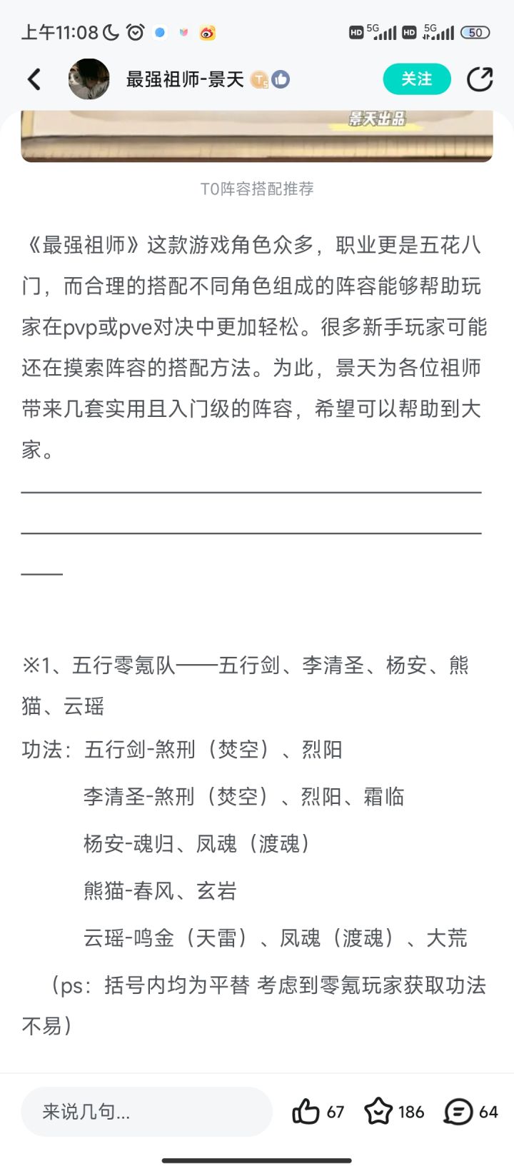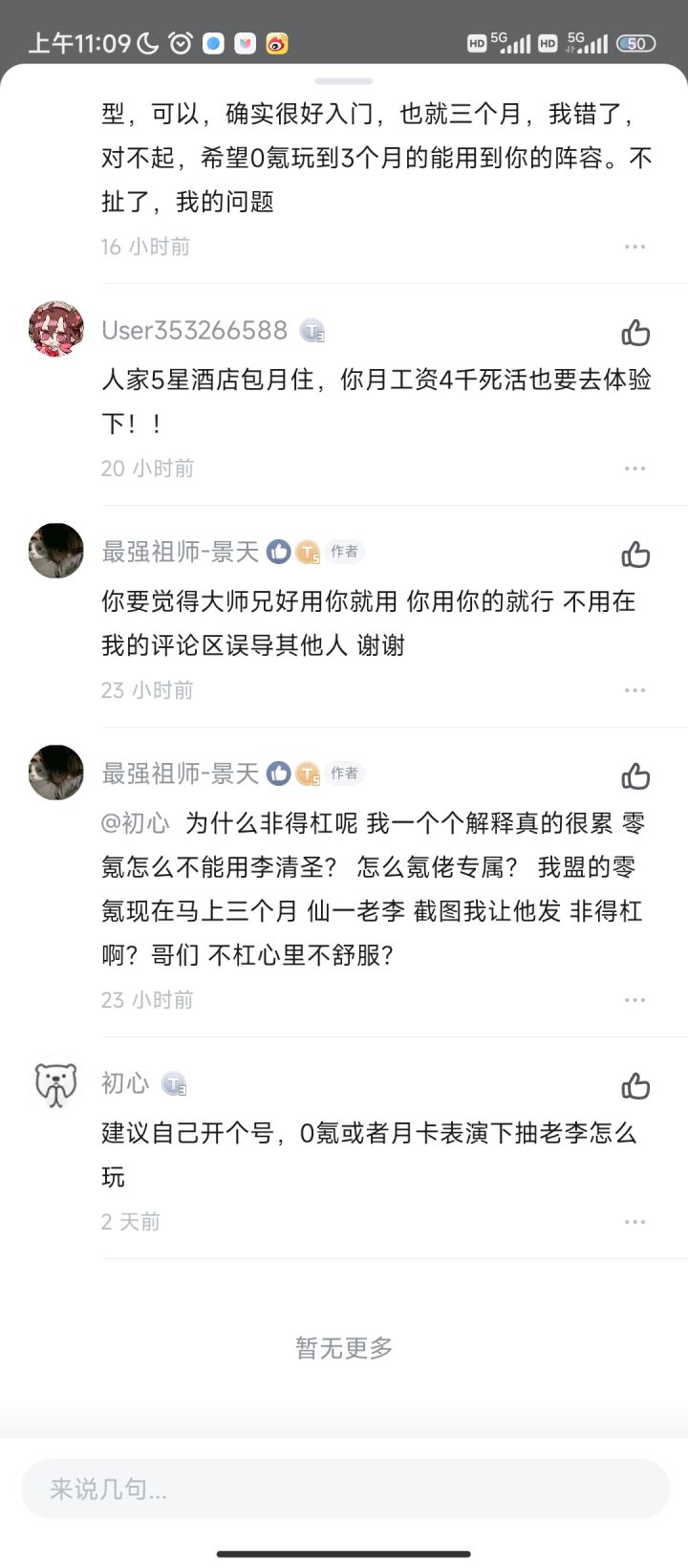 看下这个人才,没玩过0氪,写攻略靠想象力,推荐0氪抽李,我就说了没天命的李不如大师兄,这人又说谁谁谁0氪3个月仙一李,抛开你入门级阵容不谈,3个月阵容你用杨安不用五行禅?确实会玩,多的天命留着过年,拉个天火剑真不比老李输出低吧,你一期二期抽李,0氪两期也就300-400抽,一个紫命李有啥用?然后煞刑也不要是吧,0氪不囤煞刑天上来的么,云瑶也不要了?0氪写个鸣金上去,您可真会玩,还给个替换选项,请问你的0氪是不是小氪不算氪啊,真的求求这些奇奇怪怪的人玩过再发攻略吧,0氪真的需要囤才能走煞刑,或者你也可以说煞刑不重要,那你确实会玩,李很强,但不适合0氪。逆天发言➕1,0氪4个月没多的天命升五行禅。你是人才辈出刷出来的吧,确实人才