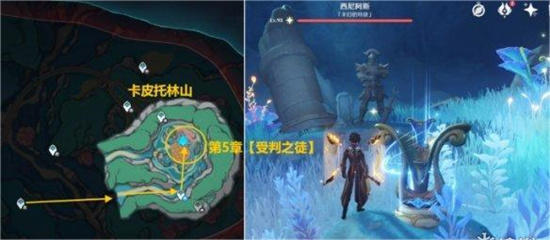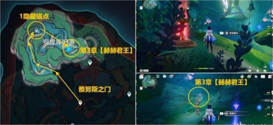 1、解锁:隐藏锚点没有解锁前是不会在地图上显示的,在解锁第一个隐藏锚点的情况下,玩家可以直接传送到下图中隐藏锚点1的位置,再往右下方走到第3章“赫赫君王”乐章的位置即可拾取。