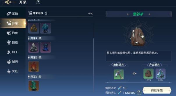 和采摘类似,需要用到开采工具和体力,获得的物品主要用于锻造和加工。 推荐等级:五颗星