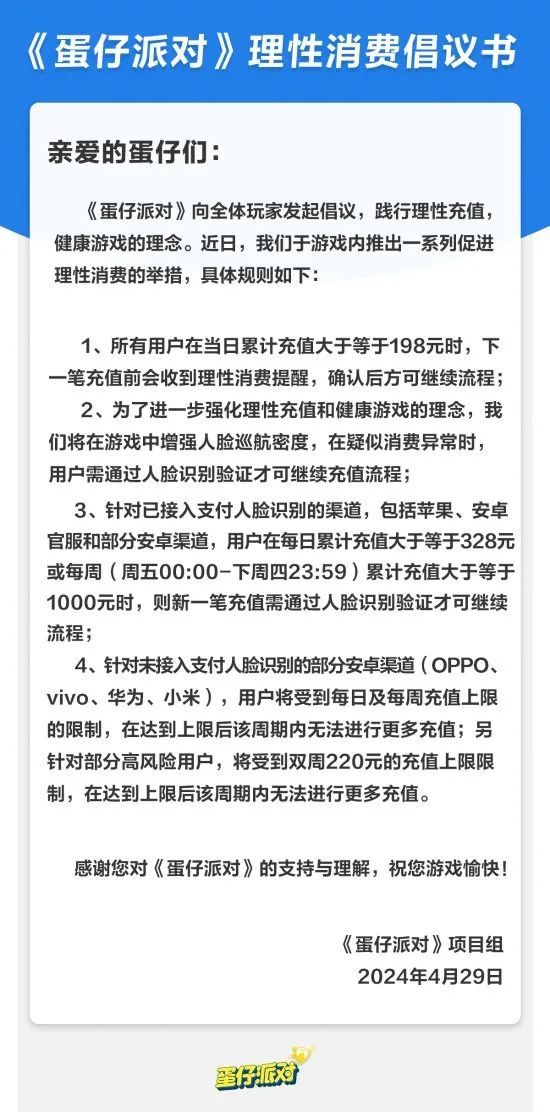4月30日,《蛋仔派对》官方发布《理性倡议书》,宣布将面向所有用户推出一系列限制消费的举措,包括增设充值上限等。倡议书中写道,所有用户在单日累计充值大于等于198元时,再次充值便会收到理性消费提醒,确认后方可继续充值。