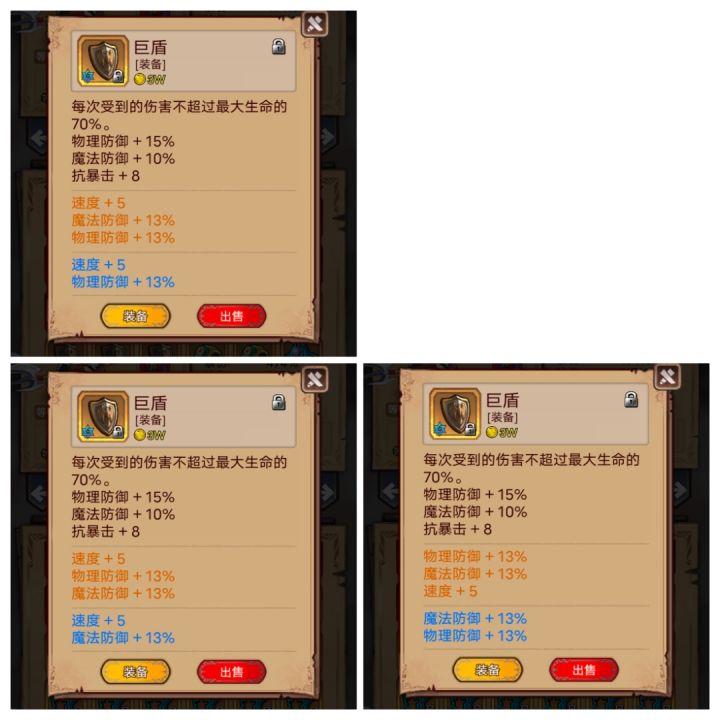 巨盾是最高贵的橙防装,15%物防的面板和受击70%锁血的特效非常强力,最好能够人手配备一个。