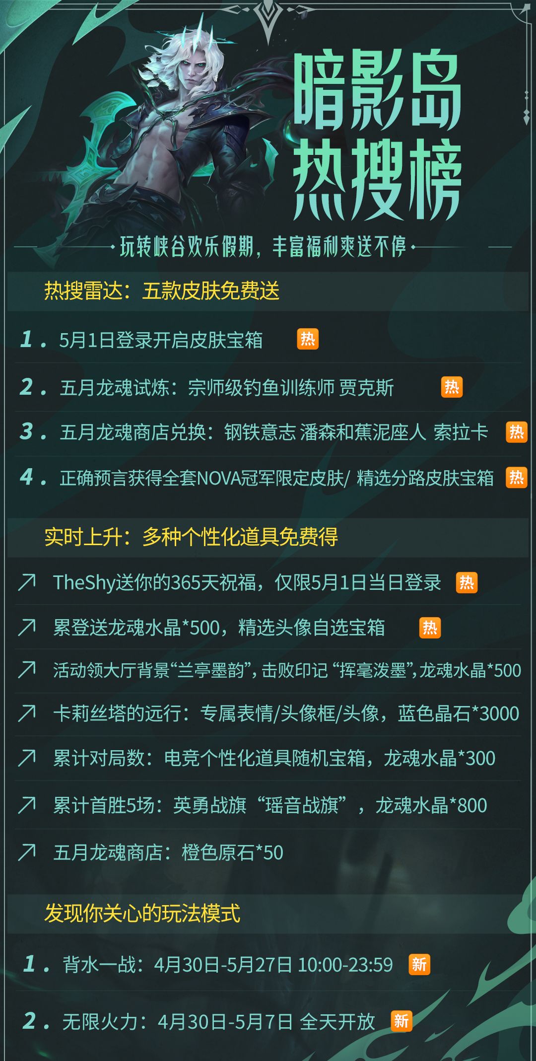 5月龙魂试炼,热血开启!即日起,至5月28日23:59分 ,召唤师完成对应阶段的任务,即可将宗师级钓鱼训练师 贾克斯、龙魂水晶*3000和专属奖励三选一的大奖拿下~其中,每个人的专属大奖各异,召唤师可前往游戏内查看。