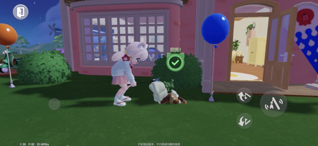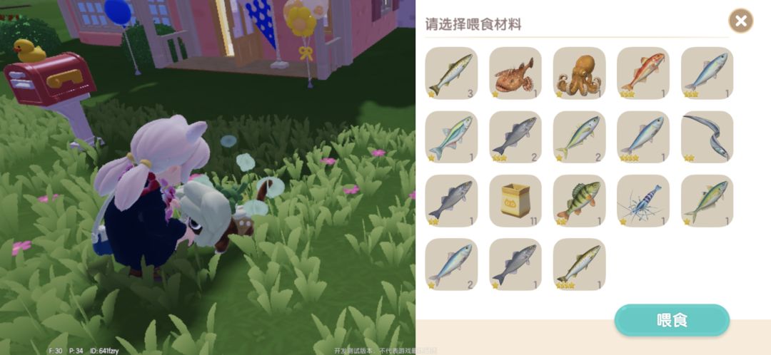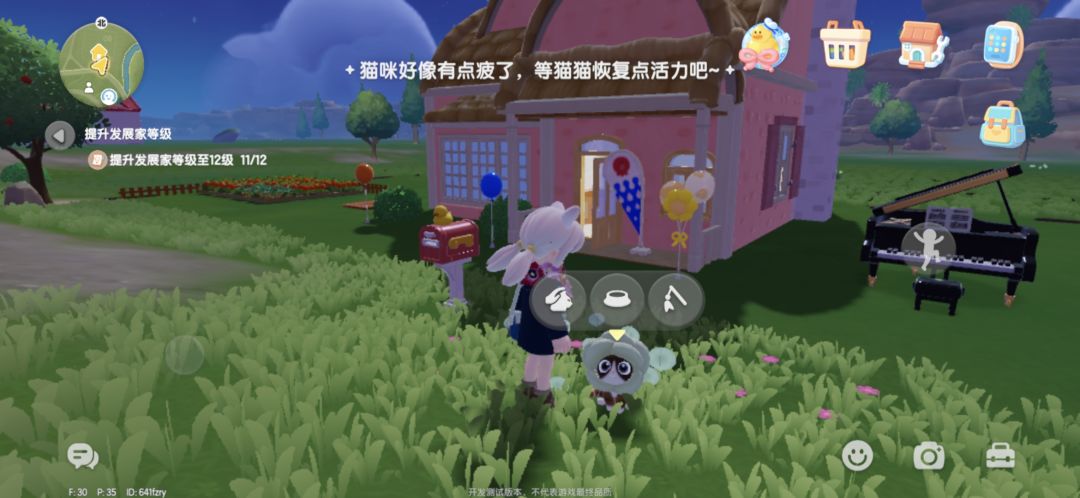 然后按任务要求,靠近猫猫就会出现三个按钮第一个按钮就是撸猫,撸猫会消耗一点体力,并且增加养猫爱好的经验和猫猫的成长值,接下来给猫猫喂食,第二个按钮,喂那个猫粮的同时左边会显示猫猫的饱食度,也会增加成长值和经验。最后一个任务就是逗一逗猫,也就是第三个按钮,这次测试比上次已经方便许多了,就跟着提示点旁边的三个按钮,只要在绿色进度条走完以前点下就好啦!然后慢慢的就会增加猫猫动作学习的进度,结束以后还会增加成长值。