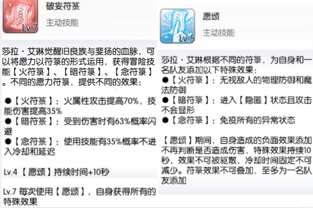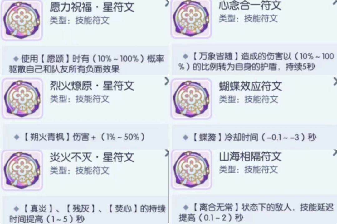 【愿颂】, 自身+1名指定队友buff。根据自身选的火/暗/念符,添加相应的buff效果。