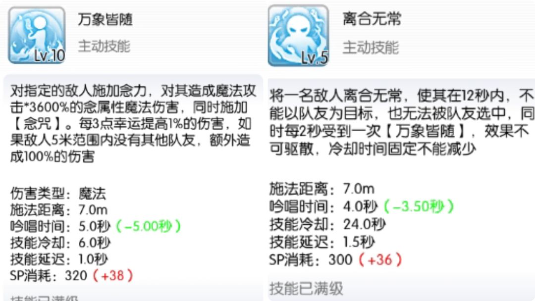 【万象皆随】,指向性的念属性魔法伤害,幸运越高伤害越高,目标独自一人时额外造成100%伤害(这里不确定是不是加上幸运伤害后的双倍伤害,不敢乱写)。对敌方附加【念咒】。
