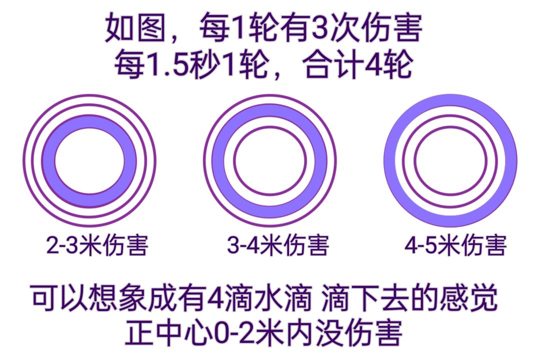 【蝶漪】,范围暗属性魔法伤害,对敌方附加【暗咒】。蝶漪每1.5秒产生一轮波纹,合计四轮波纹。每轮波纹会造成三次不同范围的暗属性伤害。