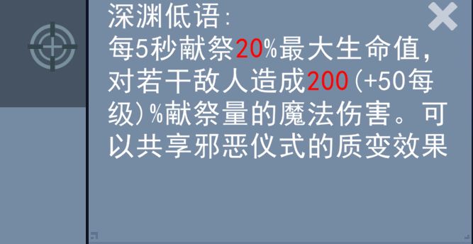 深渊低语这个技能很变态,伤害很高,但就是会消耗自己生命,有人可能觉得都拿深渊低语了也要拿邪恶仪式,其实没必要,邪恶仪式加的那点生命不够看的,商店一个心心都能加200,没必要浪费一个技能栏,只拿深渊低语就够了,当然,有空余的技能栏还是可以搭配邪恶仪式