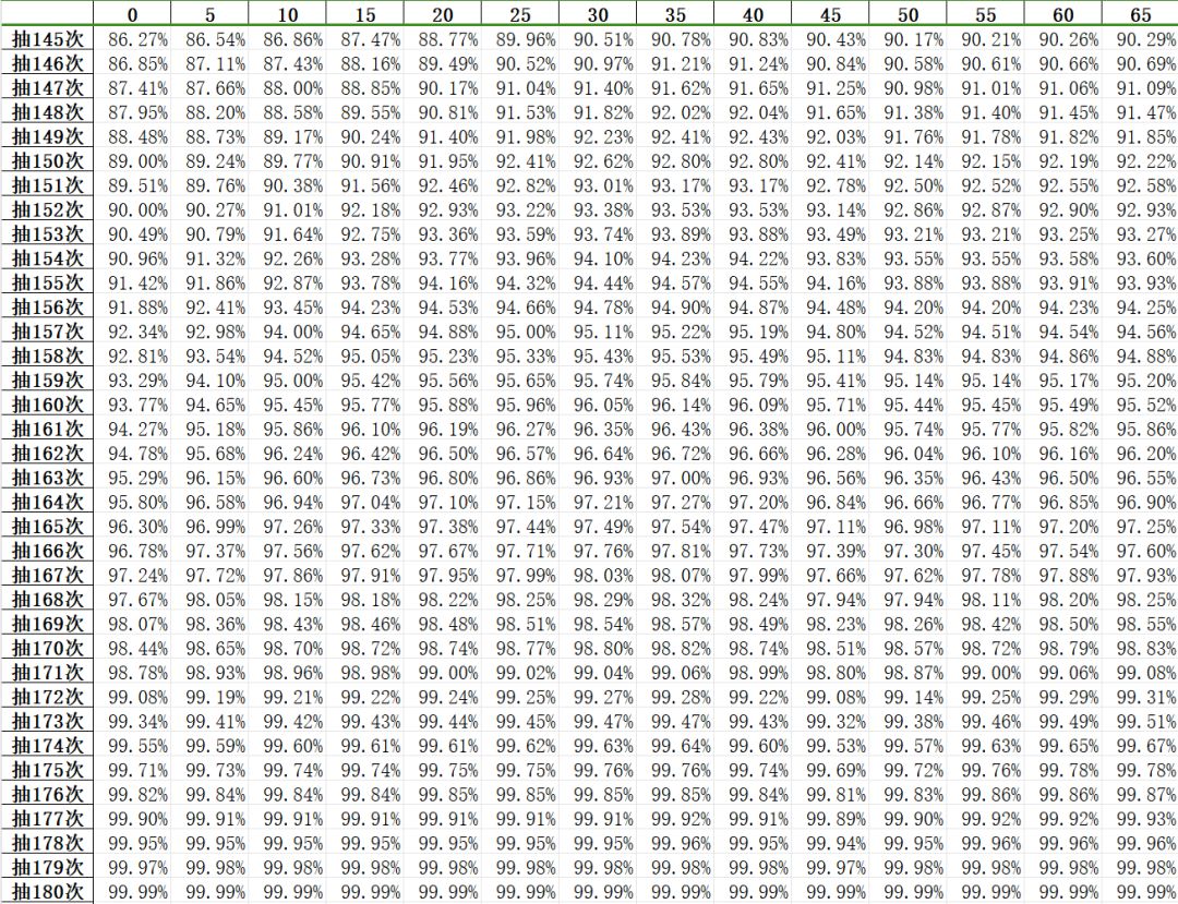 4、倘若你打算在新池子开启后以95%,90%,85%,80%,75%,70%的概率至少抽出一个up角色/武器,请分别准备好至少163抽,152抽,143抽,136抽,130抽,124抽。