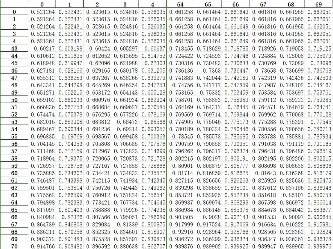 笔者将计算结果整理为190个(因为无论初始状态如何,190抽必定抽出当期up)xlsx文件,用玩家预计投入池子的资源数量,作为每个文件标题,每个xlsx表格中每一格的行索引和列索引,分别代表了初始状态下的“当前未出金次数”和“当前祈愿值”。