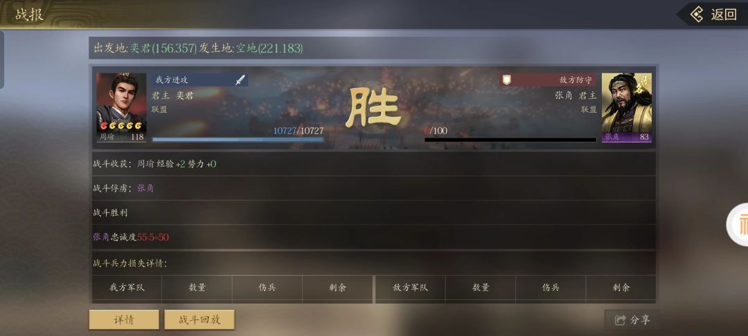 黄巾军最大的优势就是人多,张角要是被万千信徒们簇拥着,想要打他一下还确实是困难极高且风险极大。不过落单在空地上,还真就是一个冲锋就搞定。话说咱的周瑜这一波很走运,才把张角的忠诚度打到50点就一战擒获了对方。《王者之心》的三国名将都是唯一存在的稀缺资源,建议每天都刷刷客栈小道消息,碰上这种刚好在空地上发呆的,一定从速捡漏!