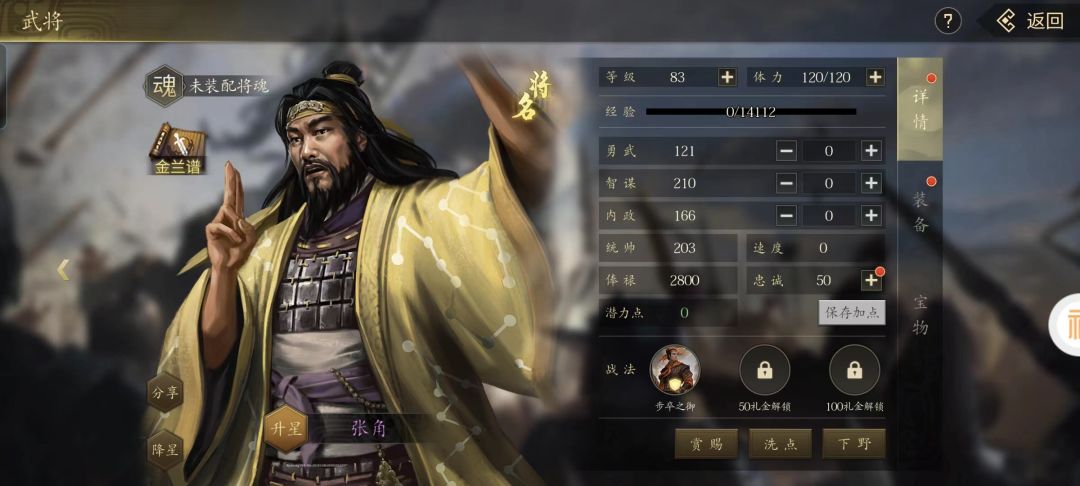 初始智力和统率值都在200点以上,看来张角在《王者之心》走的也是法师路线。平时没什么事的话,在家里做个长史,倒是也能翻倍加快科技的研发呢!当然各位也可以用洗髓丹对他进行改造,倒腾成武力值强势的猛将,再配上投石车等远程战法,也是相当炸裂的存在。之后把张宝、张梁这两个弟弟凑齐,还可以激活将魂加速度!