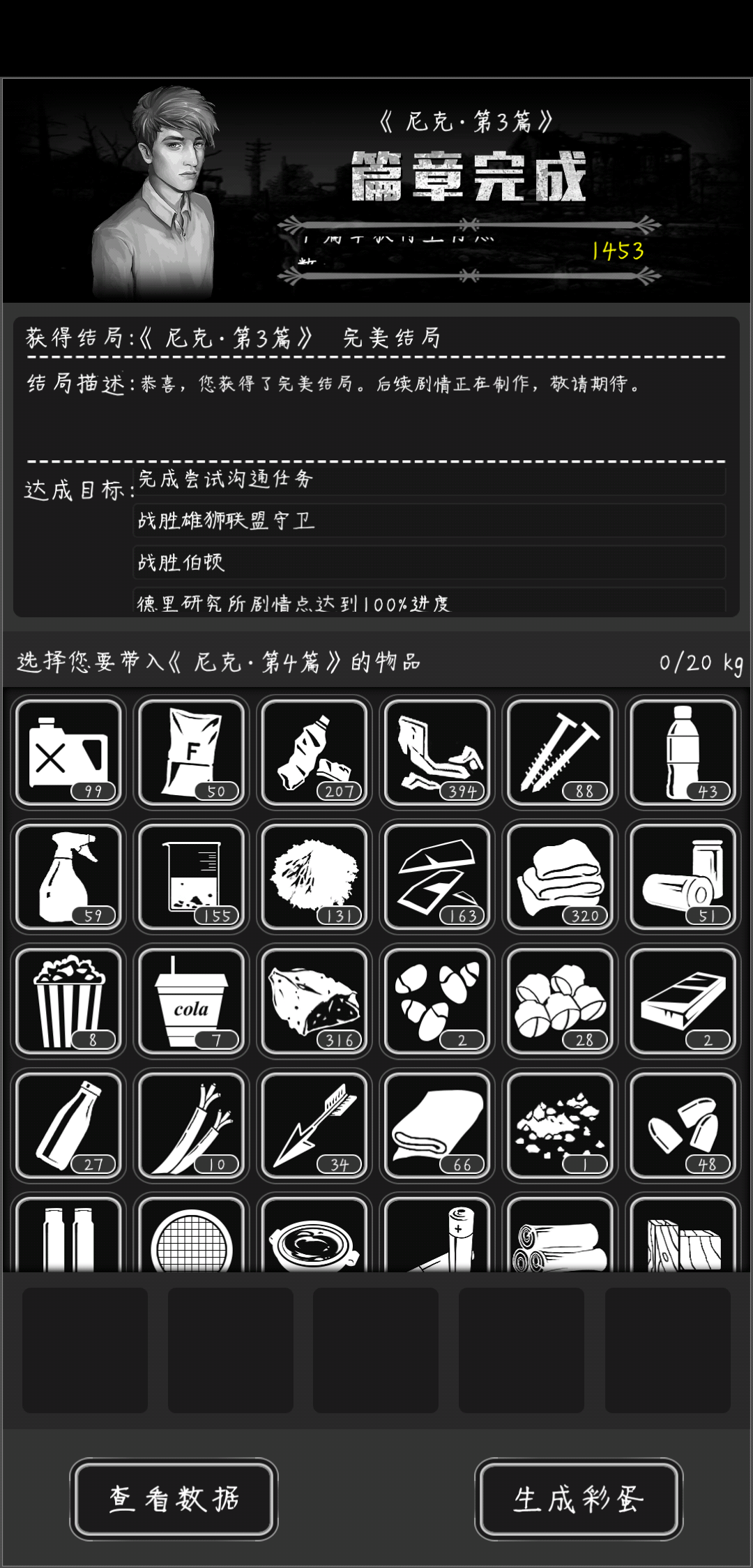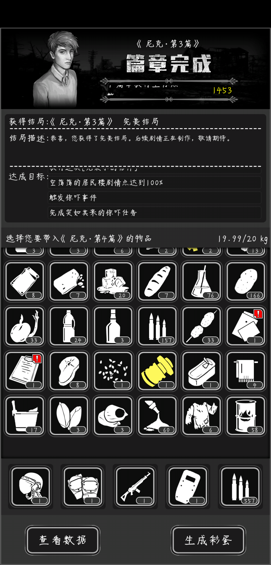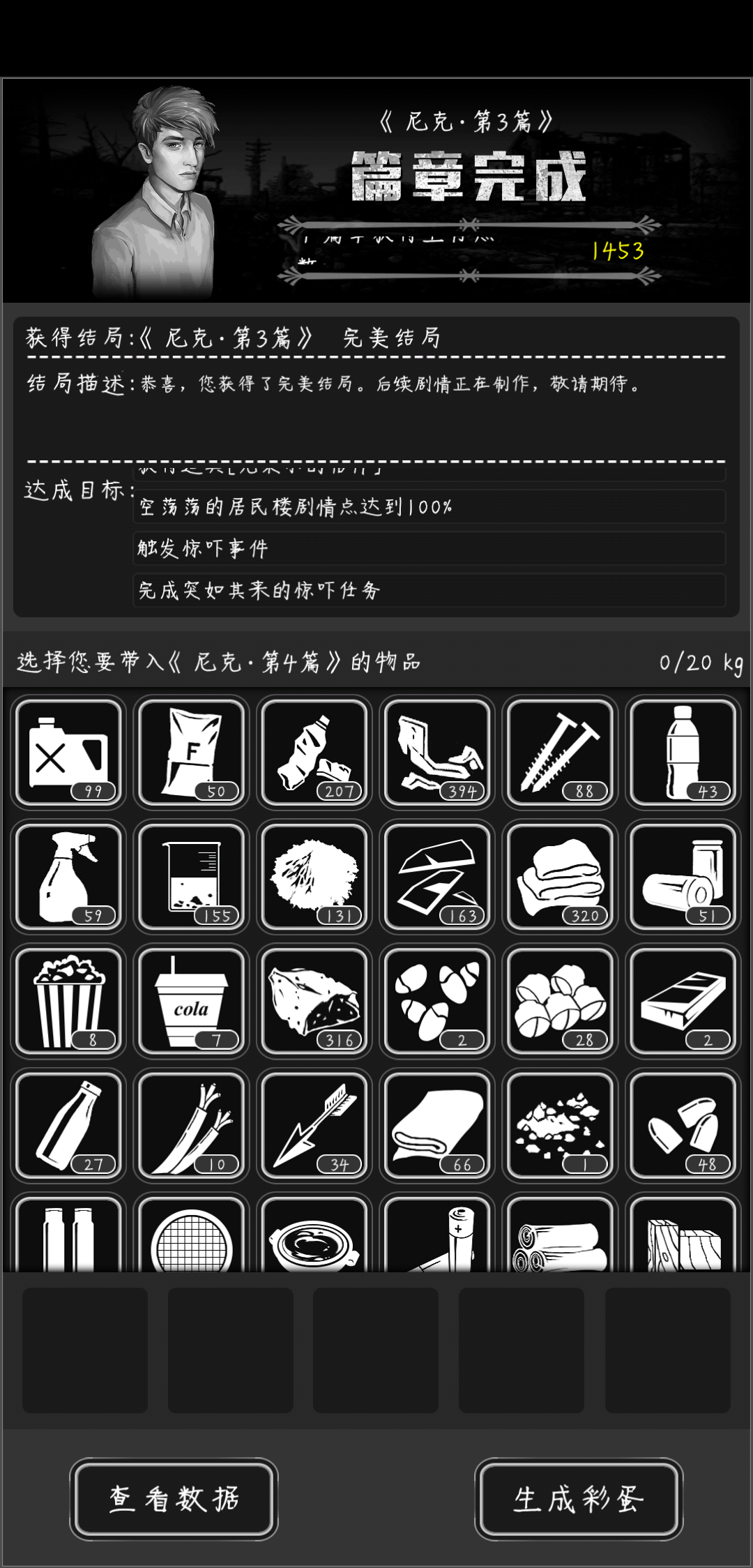 基本上都不用带什么到这一章,开局什么都有,隔几天一直有人送食物,我就就带了这些去下一章,剩下看图吧!