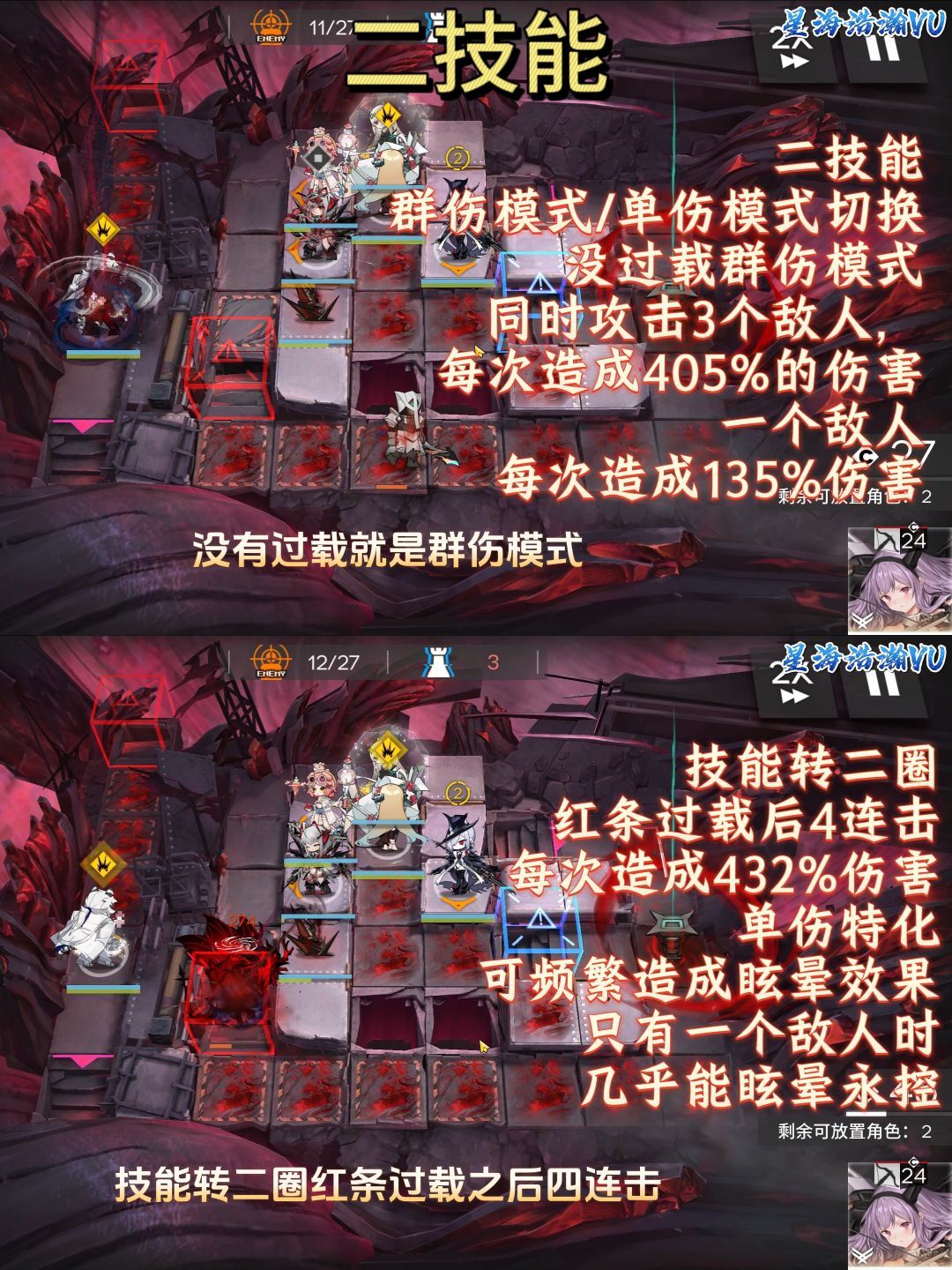 模组3级后,W每次普攻,对主目标造成125%的额外伤害,且有15%概率对群体敌人造成175%,范围直径2.2格的群伤和一秒群体眩晕,可对空,潜能4后造成185%的群伤,能打断敌人的蓄力攻击,冲锋手的加速奔跑,阻碍敌人前进