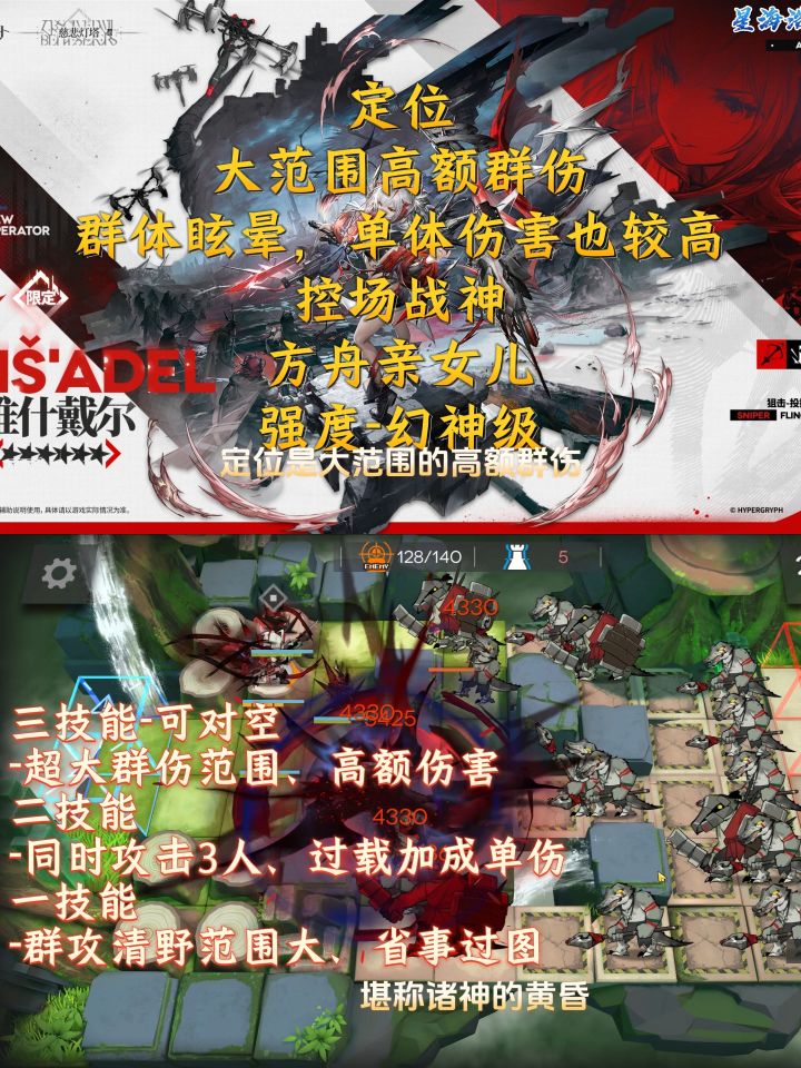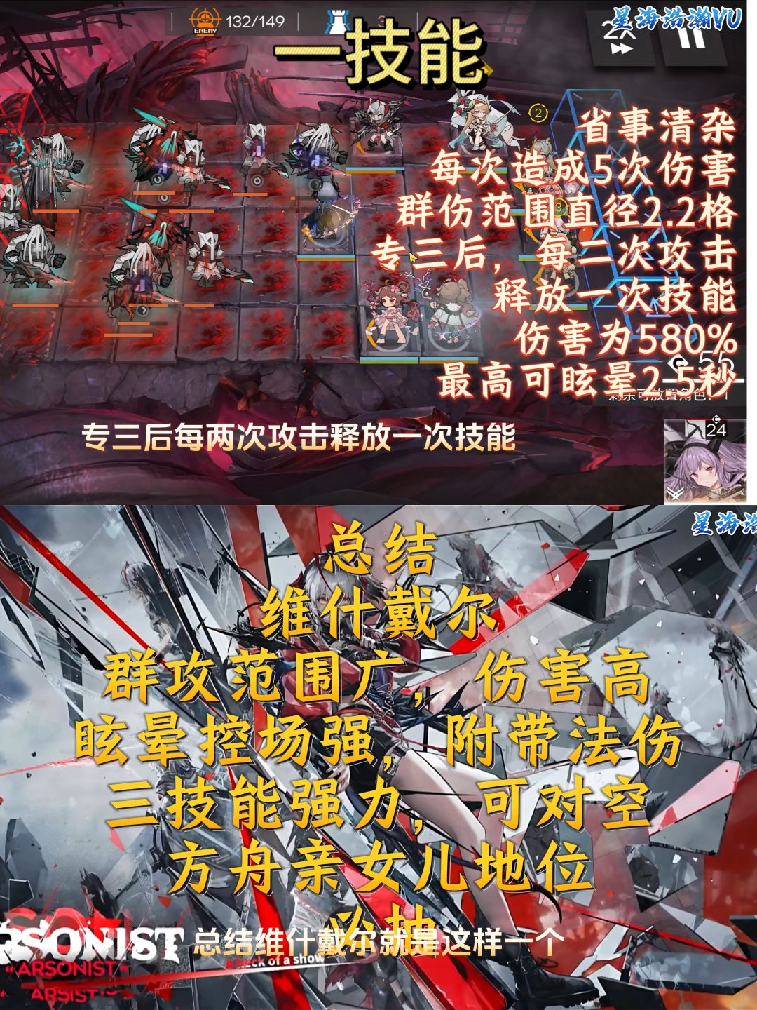 大范围的高额群伤,群体眩晕,单体伤害也较高,控场战神,自身攻击范围广,依托w高能的战斗机制加成,W在游戏全模式中都有很好的战斗效果,方舟亲女儿一样的地位,强度幻神级