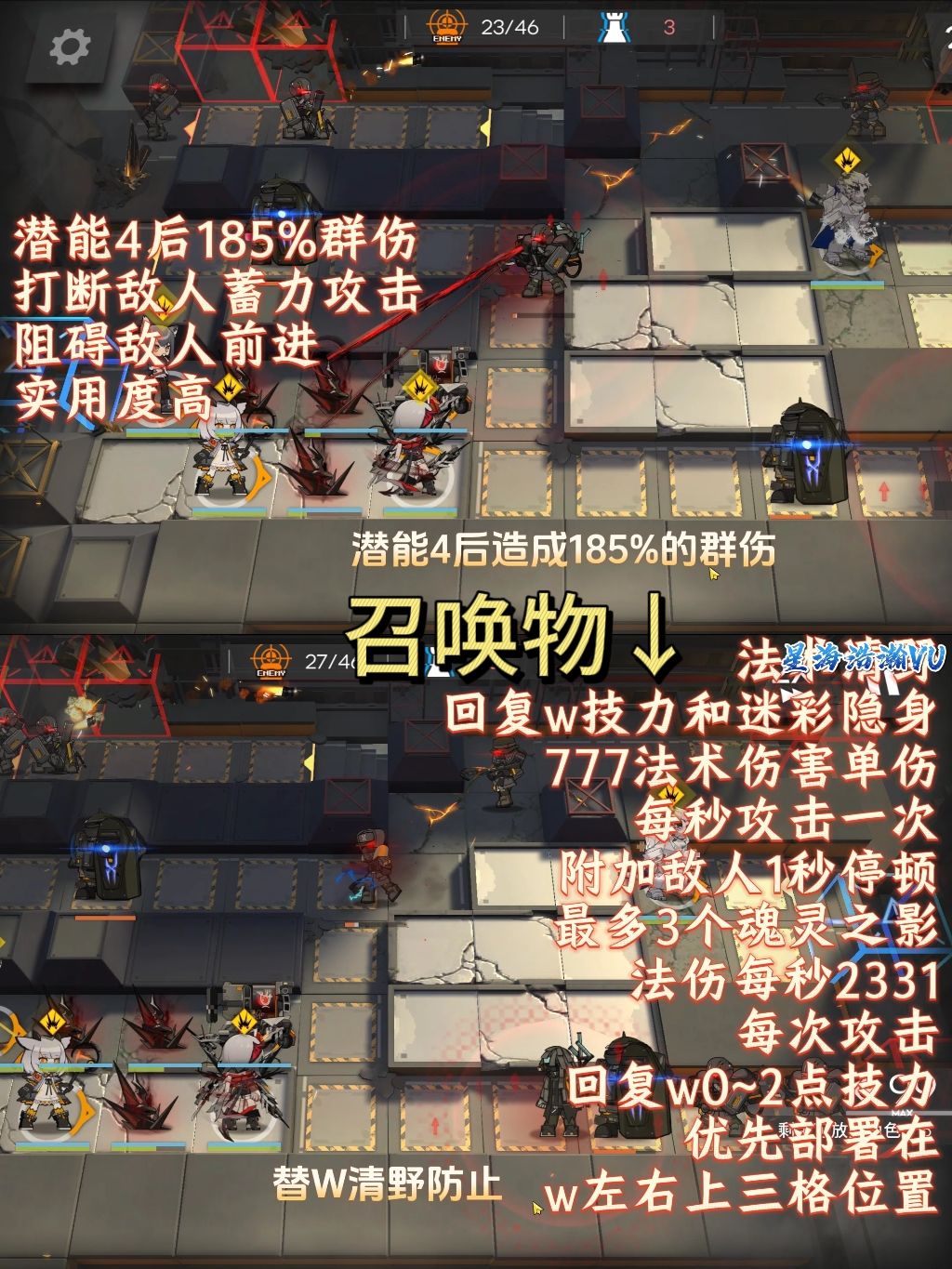法术清野,对w回复技力和迷彩隐身,对w起到很高的加成,,777法术伤害单伤,每秒攻击一次,攻速快,替w清杂,也防止浪费三技能仅有的6发弹药,最多存在3个魂灵之影,法伤每秒2331,每次攻击回复w0~2点技力,优先部署在w左右上,三格位置,绝大多数情况下,w都能被迷彩隐身,自身属性强(3500血量,650防御,50法抗,)相当于一个重装的生存能力,但召唤物不可对空,会受到敌人攻击