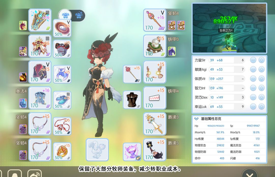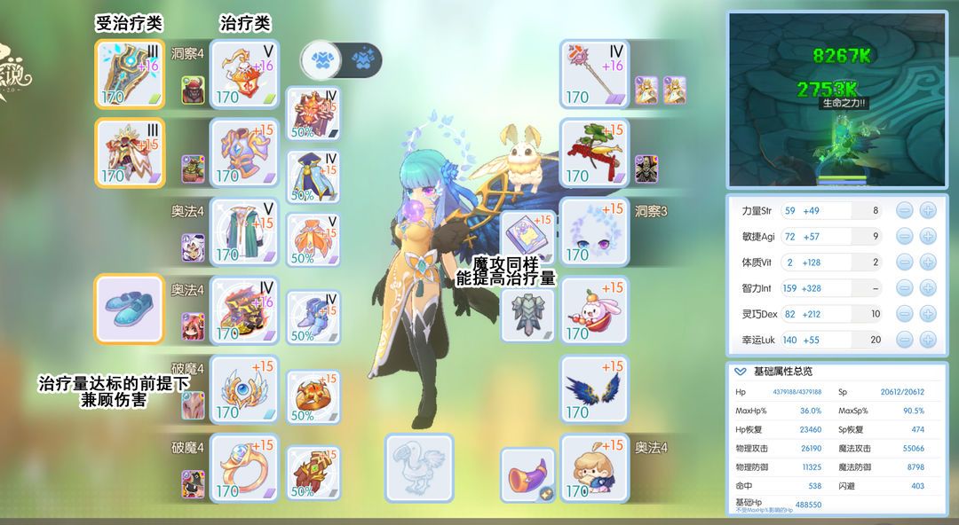 配装原则:生命之力治疗量1/3≥自身血量1/2,提高治疗量,降低血量,其他装备法系输出向。