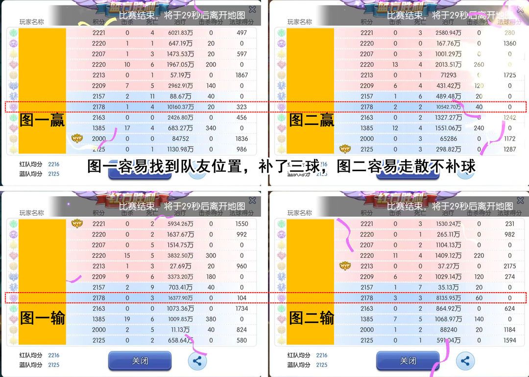 我方龙妹以保护后排为主,连接偶尔在魔导与大蛇间切换,面对对方单点骚扰后排时,每秒200w+的恢复配合牧师治愈之光,让我方持球保持很好的血量状态,面对对方全员进攻一波攻势,用诸神的黄昏+救世之花,让全队拥有6秒无敌(时间虽然比信仰短,但是作用在全员),拖慢对方下球速度,很大机会能保住我方持球。以下为与分数相近队伍碰撞的战绩,无论是输或赢的局,龙妹都提供大量治疗,我方持球死亡数均不高。