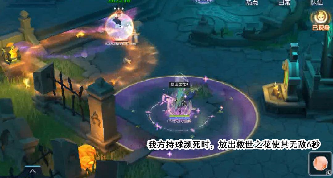 不同于救世之花,花之守护技能为不可移动地面buff,减伤效果并不限制己方或对方,只要踩进花里就有效,此外还会被蛇转换,实战下来效果不算很好。