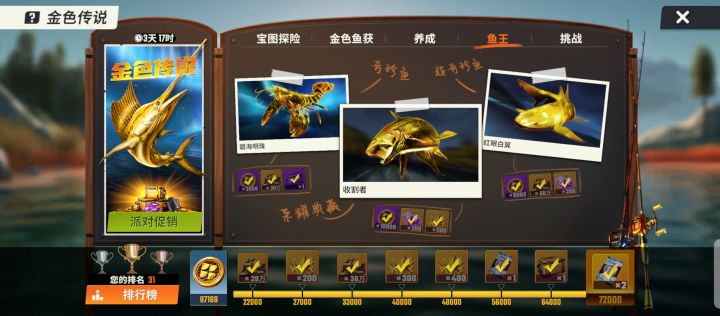 第1:选择锦标赛的地图然后对应我那个图片的上的buff配对 第2:用三体钓15杆,用10体力正常的,钓出典藏鱼---鱼骨然后再钓出藏宝图,然后进藏宝图,用最低的体力钓,就可以出典藏鱼了。 第3:如果说你的鱼骨钓出来,典藏于你,千万别把钓出来,你得先把你的藏宝图是第2部 第4:第1步:先调出典藏鱼,鱼骨,然后再调出藏宝图,配上三buff你的典藏鱼就能钓出来了
