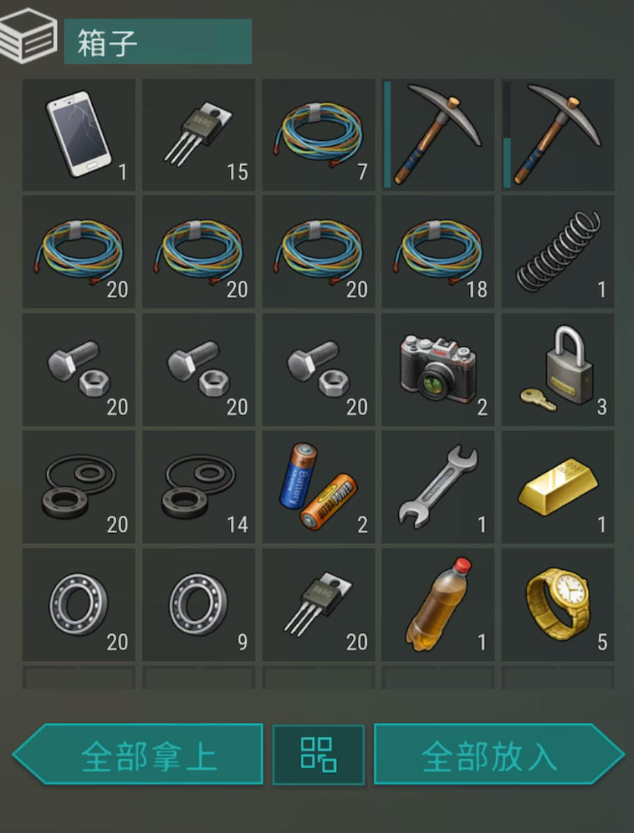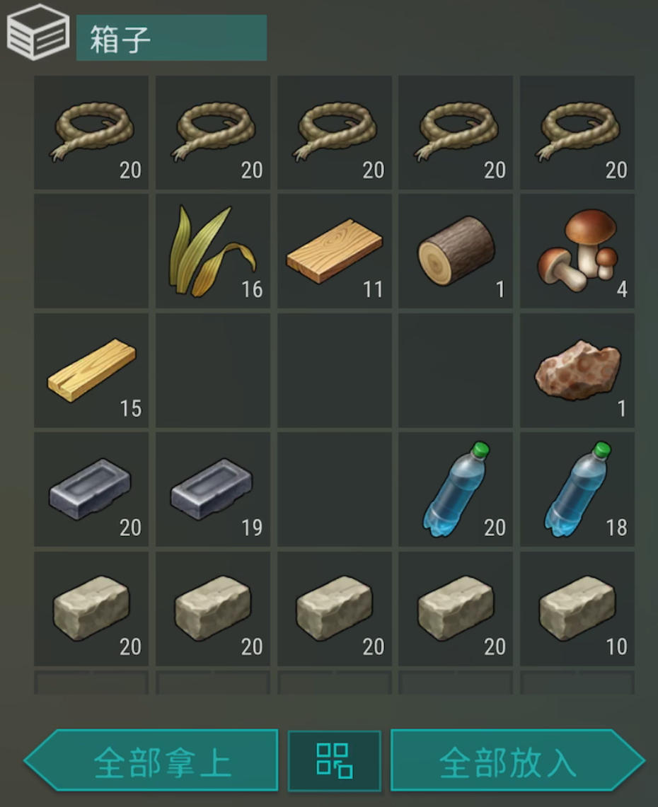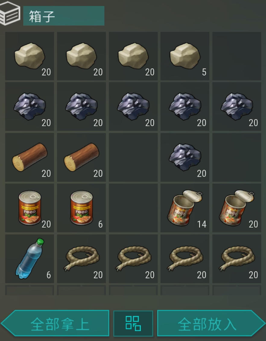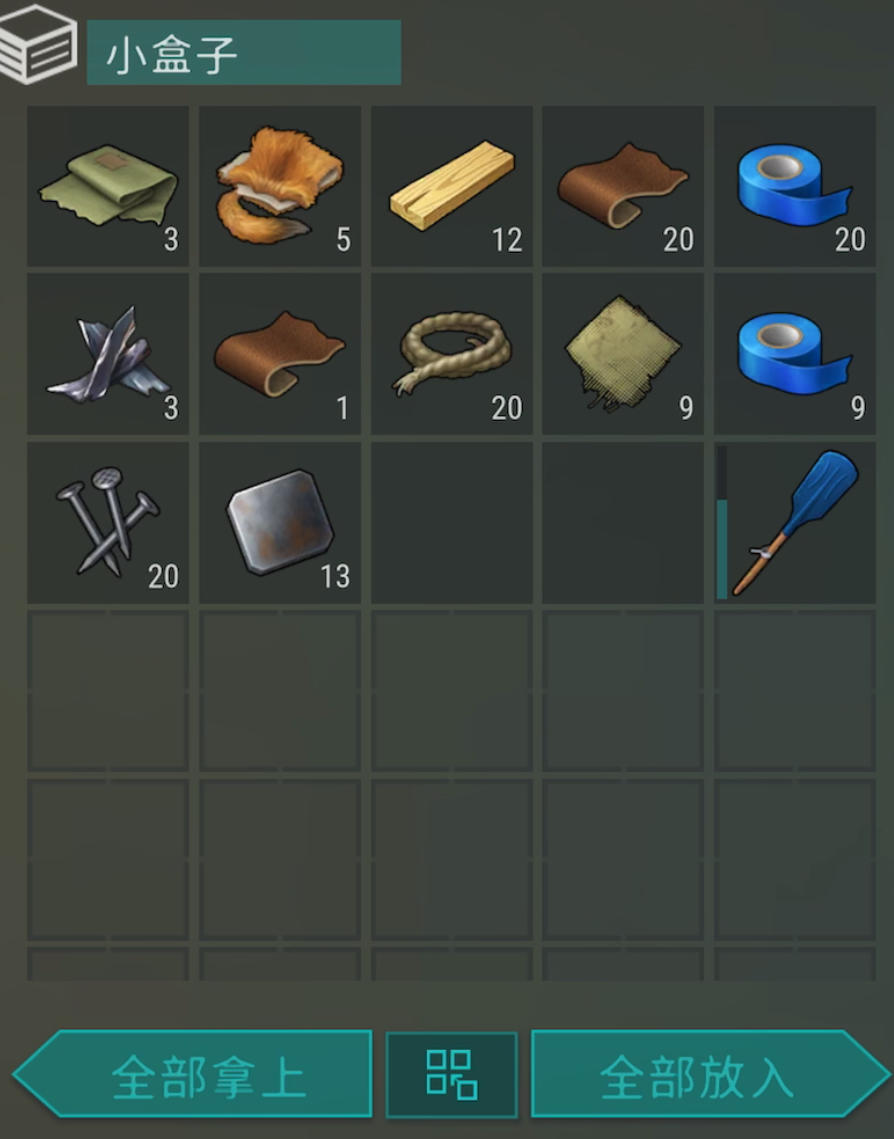 如图,箱子顺序从上到下,带5石斧3铁斧即可