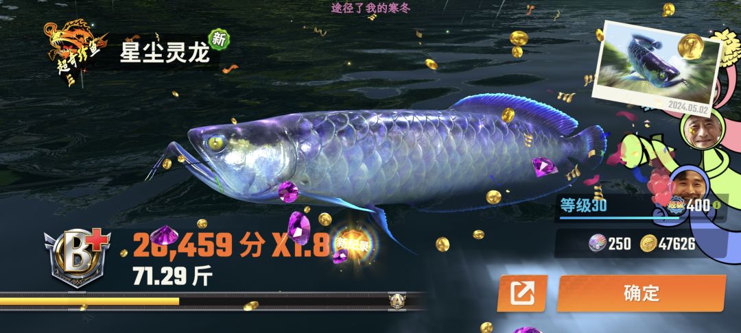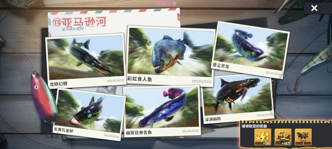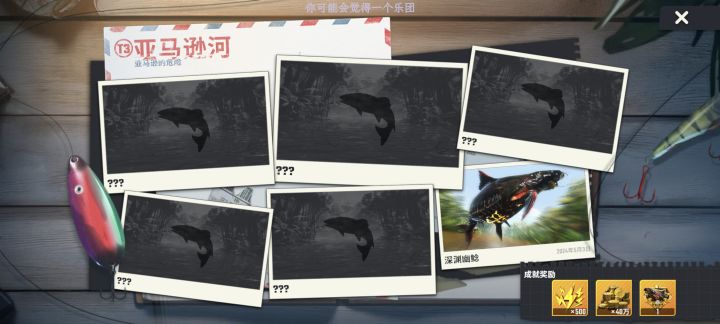 一小时满图鉴,准备好体力,刷个幸运大鱼直接钓,藏宝图低体力开掉,拿骰子跟其他活动混体力,现在藏宝图掉完基本必出两条奇珍鱼,运气好直接典藏,巨骨舌鱼刷幸运特大,高几率鱼骨,藏宝图不好出巨骨典藏。除去藏宝图高额体力,我差不多算是300杆以下满图鉴。