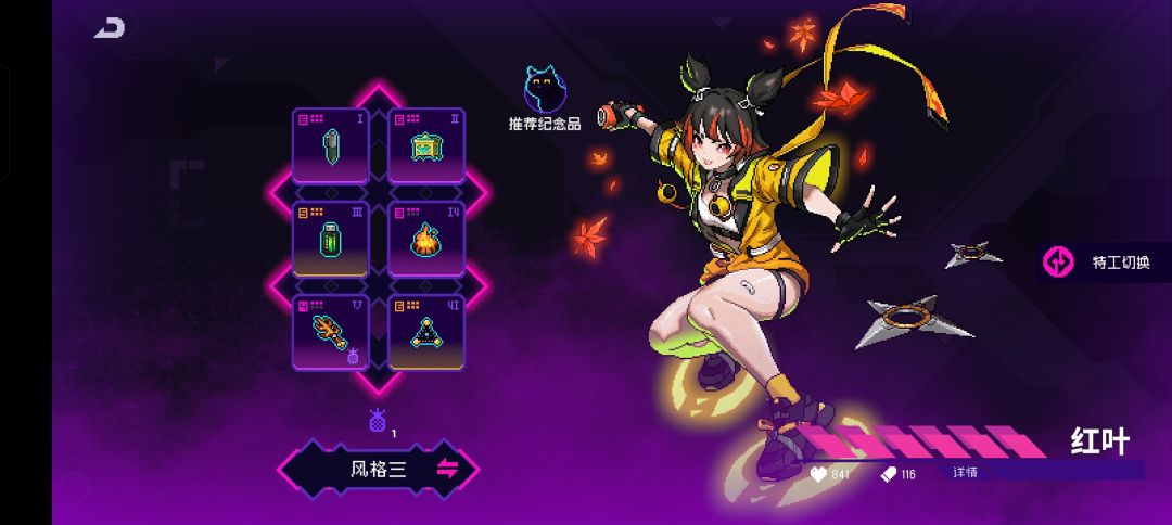如果带木头叉子那三号位几乎就绑篝火。没有火焰杯,六号位就可以带飞行,有飞行除了诸神和黑海之外就有更多的操作空间,当然火种获得不太容易,红叶本身是搞速通的角色。不推荐
