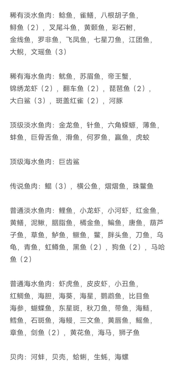 更新:图二是稀有淡水鱼肉,图三是稀有海水鱼肉,对我来说稀有鱼肉探索秘境应该够用了