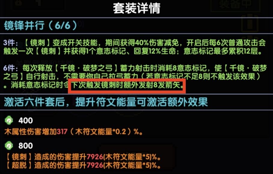 也就是说,想要触发“额外8个镜刺”,首先要释放一次“超脱”,然后等下一次“镜刺”触发时,“额外8镜刺”就会跟着触发。