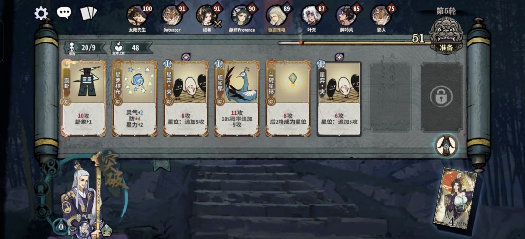 画老头前期有增加换牌次数的副职牌还有天赋多抓一张牌,练气期卡练气,为了能第五轮有上图前5张满级牌的质量,需要用科学D牌法尽量增加拿到需要牌的概率。