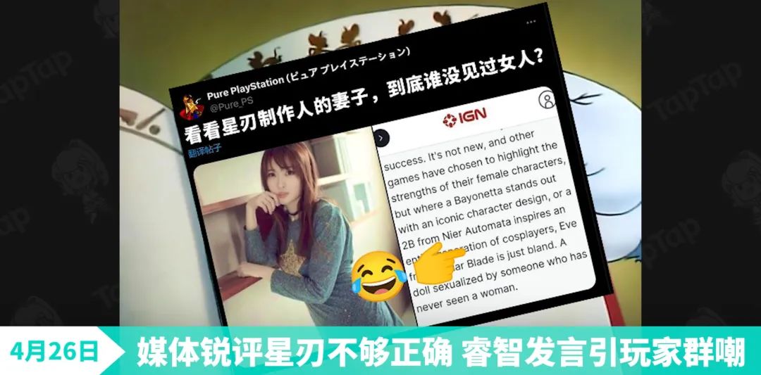 但在媒体评测解禁的这一天,瓜,还是来了。IGN法国分部在《星刃》的评测里塞了一些很离谱的私货,“《猎天使魔女》里的贝姐设计出众,《尼尔》里的2B启发一整代Coser,然而《星刃》的主角——毫!无!特!色!只是“一个从没接触过真实女性的人设计的‘性化’玩偶”。emmmm……看看他老婆,看看他老婆的插画,你说他“没见过女性”?——谁是小丑我不说。