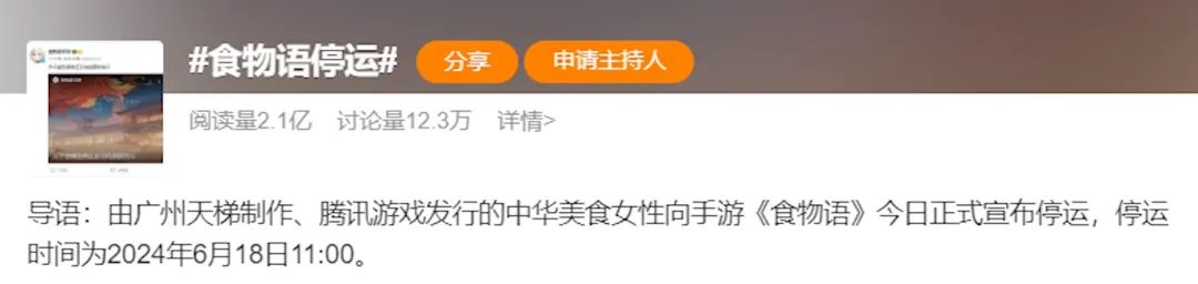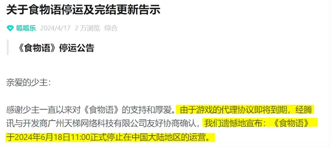 4月17日,《食物语》官方发布公告,由于代理协议到期,将于2024年6月18日,正式停止在中国大陆地区运营。