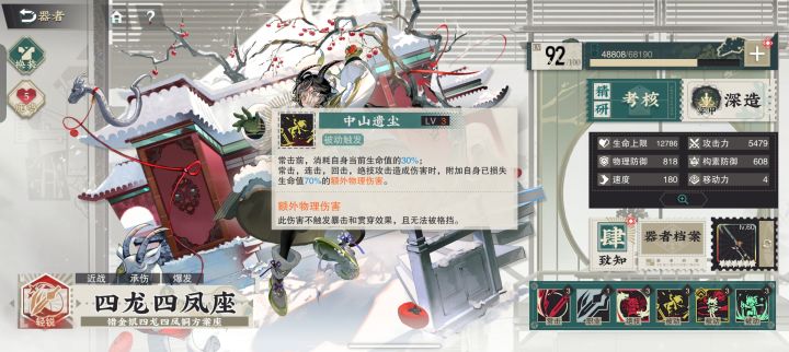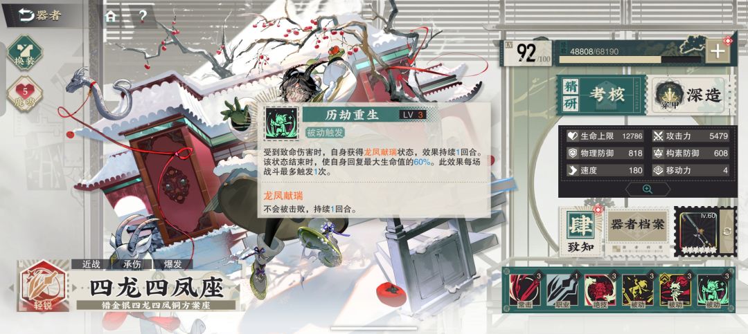 评价:锁血神技!!让四龙四凤座有了抗伤的底气,而且这个回血可以吃到暴击,触发暴击可以直接满血,自带两条命。