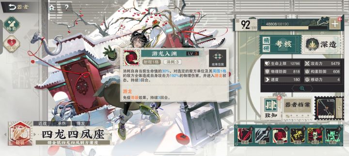 效果:攻击前消耗当前生命值的30%,对一格内的目标以及目标一格内的所有敌方造成伤害,并且获得游龙buff,3回合免疫滞缓效果(无视移动力降低debuff)
