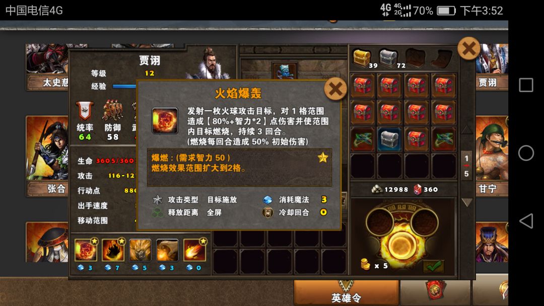 火焰爆轰,1格范围群伤,带3回合的DOT,直伤的攻击力是80%攻击+智力*2,DOT伤是每回合结束是直伤的一半,范围2格。