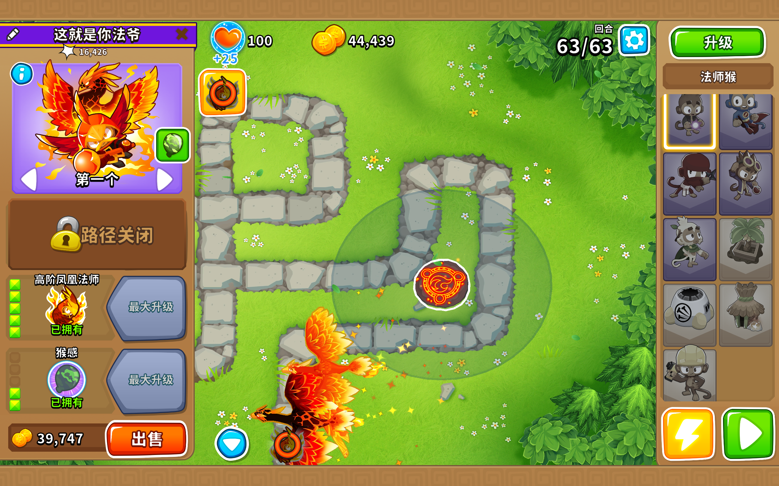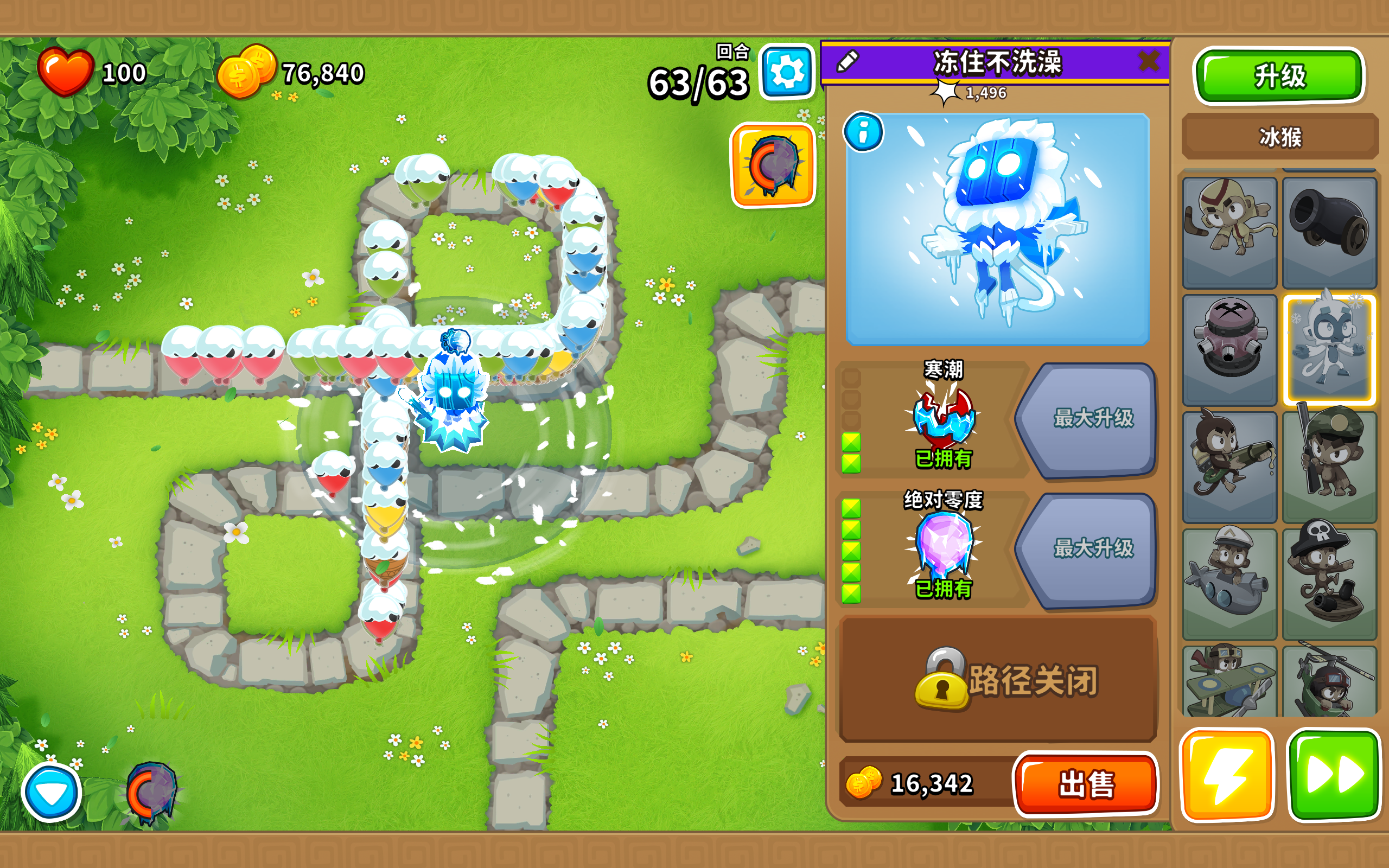 如图250冰猴,放置位置如图,技能等第一波陶瓷来后再开,之后一直点技能。控住全场的气球后卖掉换052火法,位置如图,之后火法放技能。