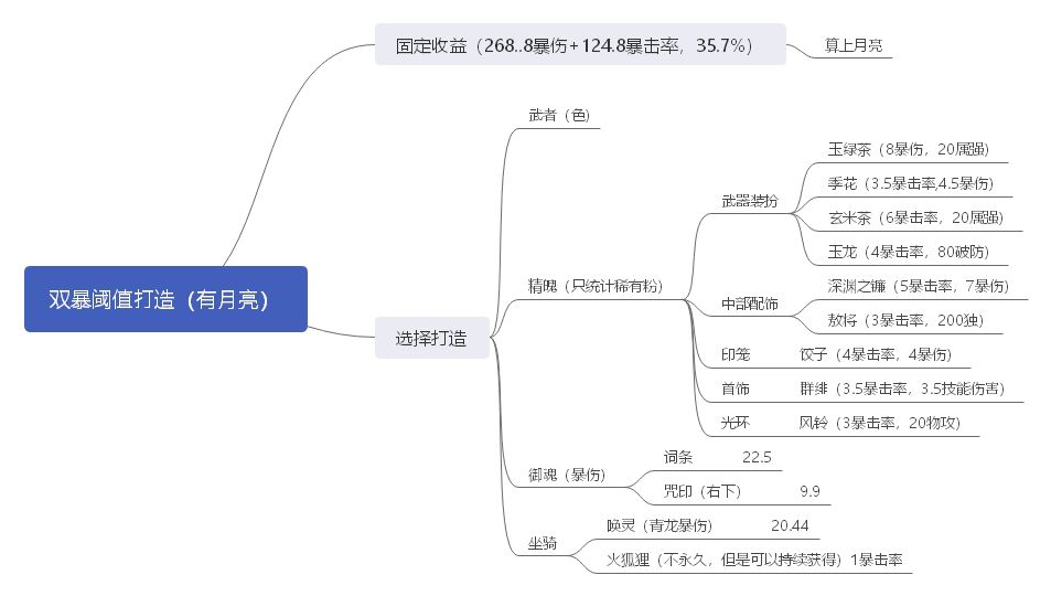 在黑夜套高双暴的基础之上,其实双暴的打造在能达到阈值之后,其双暴的打造优先级或者热度要稍微降温,寻求性价比更高的打造方式(比如属强,附加,异常)。上面我们已经看到固定收益所能够到达的外围已经能够到33%左右了,所以在阈值的打造上,我们只需要提高7%就可以。月亮坐骑作为重要的双暴因子,我们的讨论就结合玩家有无月亮展开讨论。